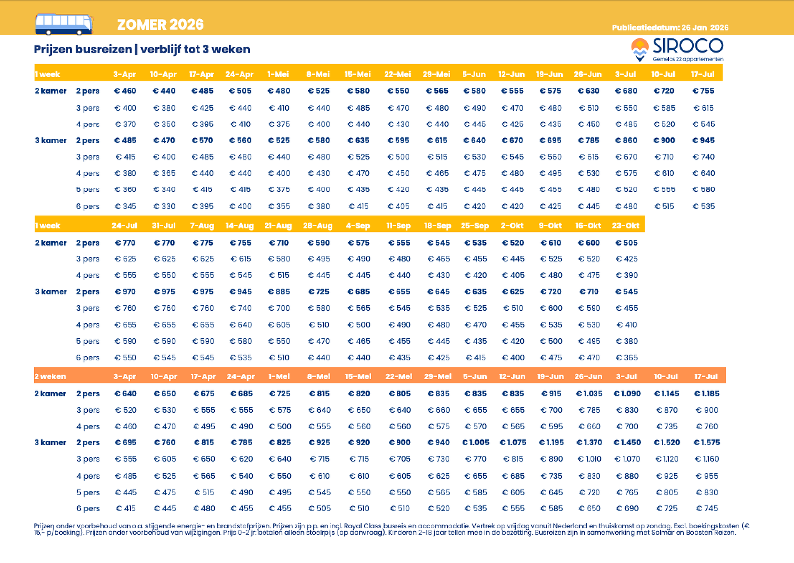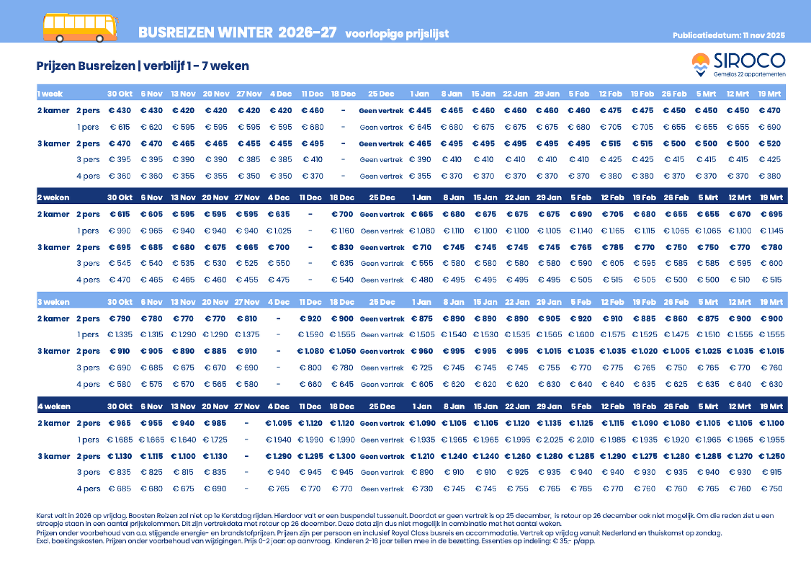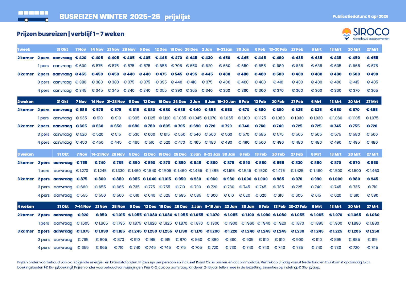 Voor busreizen in de winter met een verblijf langer dan 7 weken kunt u het beste contact opnemen voor een vrijblijvende prijsopgave. Datzelfde geldt voor een verblijf van 4 weken of langer in de zomermaanden. Voor het aanvragen van een offerte kunt u gebruikmaken van het formulier op onze offerte pagina.