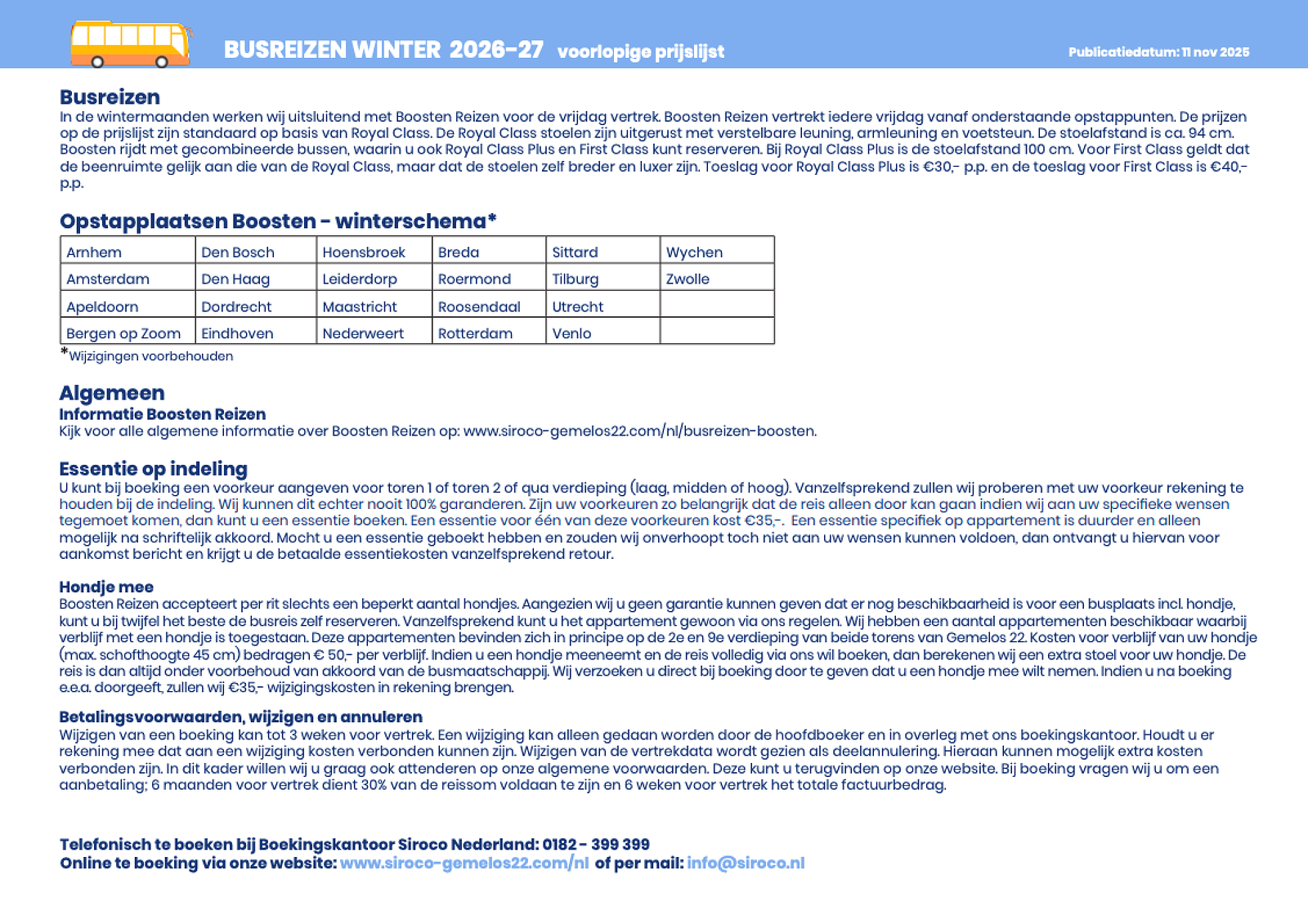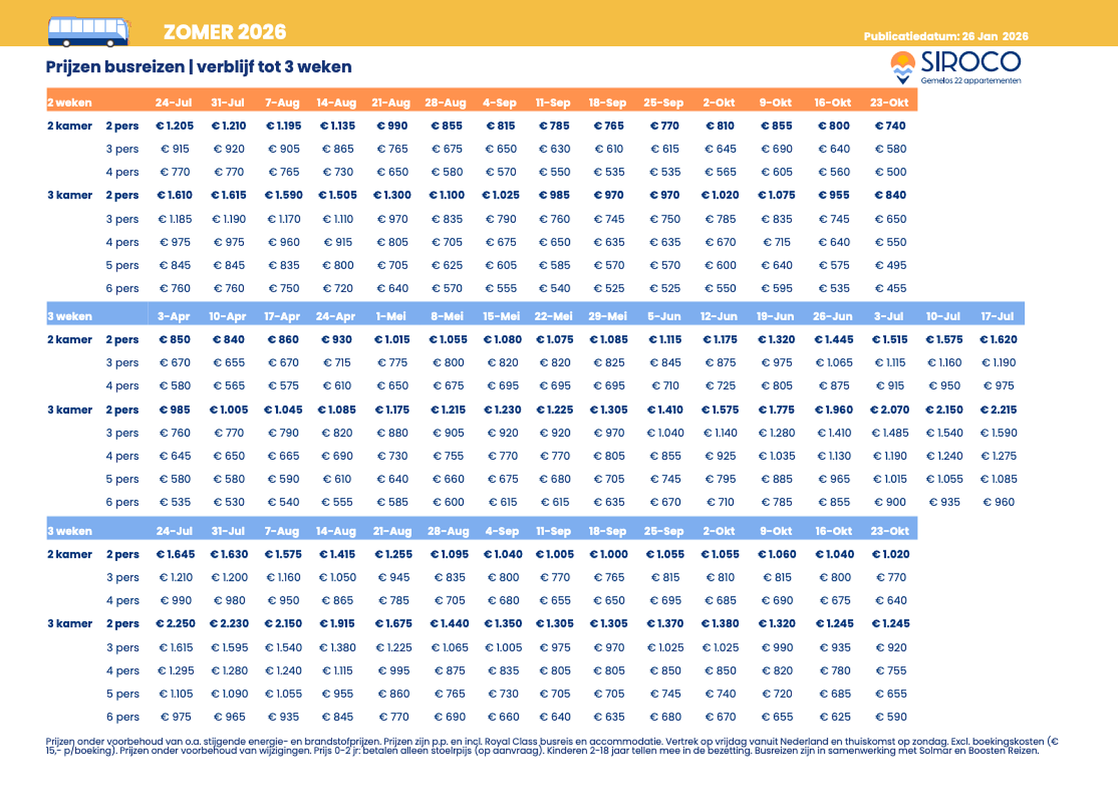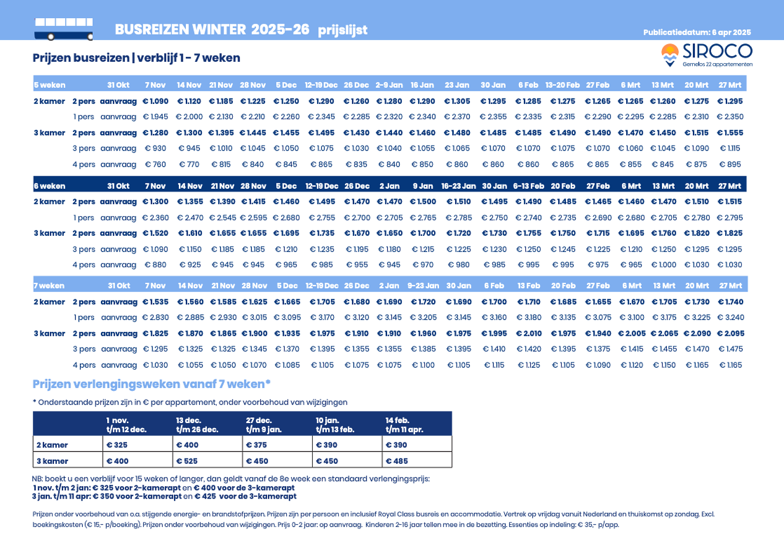Voor busreizen in de winter met een verblijf langer dan 7 weken kunt u het beste contact opnemen voor een vrijblijvende prijsopgave. Datzelfde geldt voor een verblijf van 4 weken of langer in de zomermaanden. Voor het aanvragen van een offerte kunt u gebruikmaken van het formulier op onze offerte pagina.