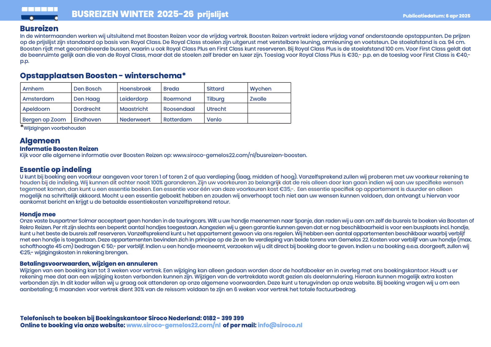 Voor de busreizen werken wij samen met Solmar en Boosten Reizen. U kunt bij uw boeking aangeven of u voorkeur voor een organisatie heeft. Indien u geen voorkeur opgeeft, kijken wij welke organisatie voor uw data de beste mogelijkheden heeft.