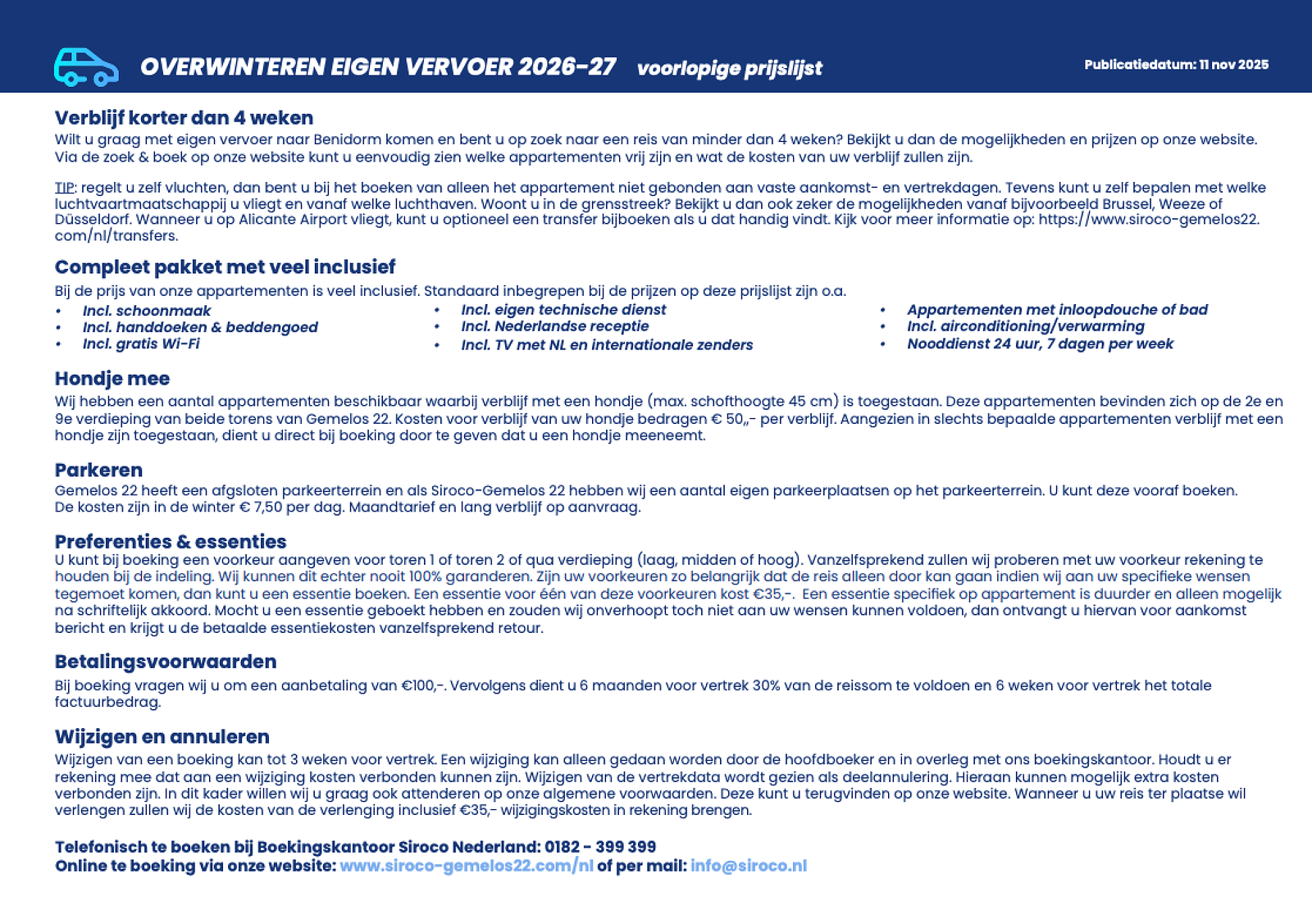 Yes, in addition to apartments, we also offer package deals, including bus or air travel. For bus travel, we work with Solmar (preferred partner) and Boosten, both of which operate luxury Royal Class and First Class buses to the Costa Blanca. Solmar is booked as standard, unless you specifically choose Boosten. For air travel, we work with Transavia, departing from Amsterdam Schiphol, Rotterdam, or Eindhoven on Saturdays. Air travel includes transfer to Siroco-Gemelos 22 with the Siroco transfer bus.