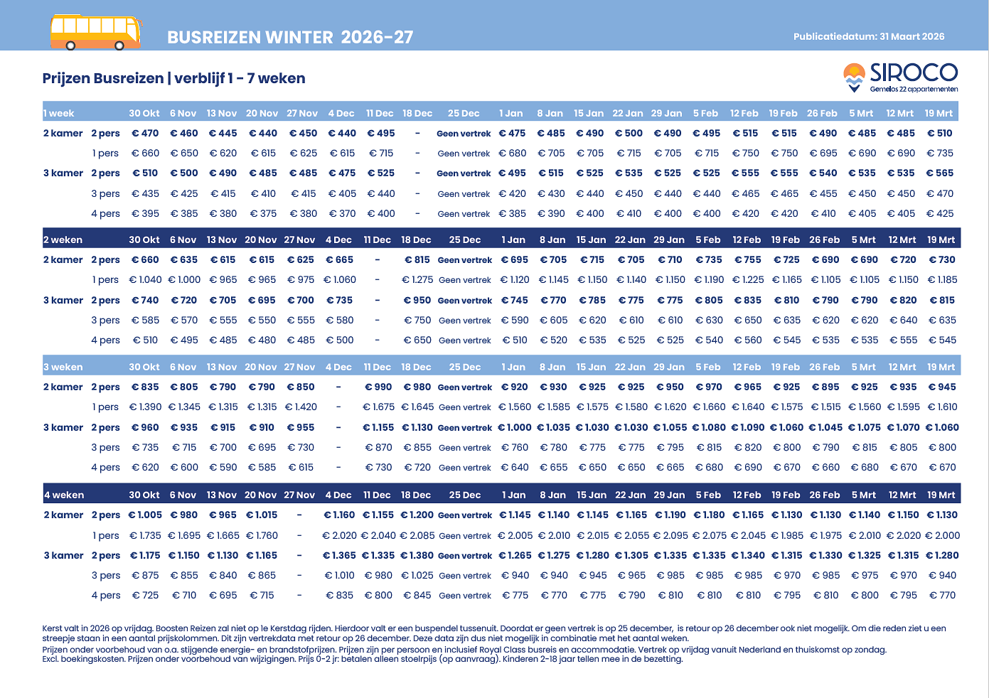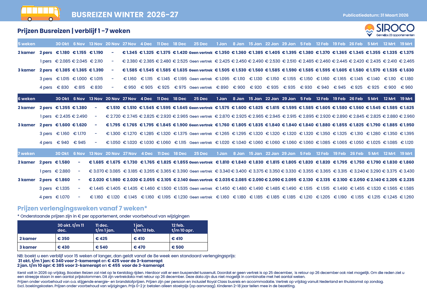 Voor busreizen in de winter met een verblijf langer dan 7 weken kunt u het beste contact opnemen voor een vrijblijvende prijsopgave. Datzelfde geldt voor een verblijf van 4 weken of langer in de zomermaanden. Voor het aanvragen van een offerte kunt u gebruikmaken van het formulier op onze offerte pagina.